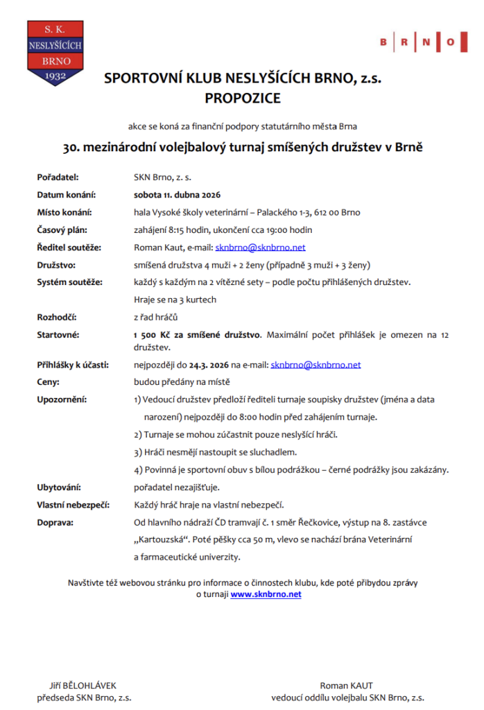 Již 30. mezinárodní volejbalový turnaj smíšených družstev v Brně se bude konat 11.4.2026