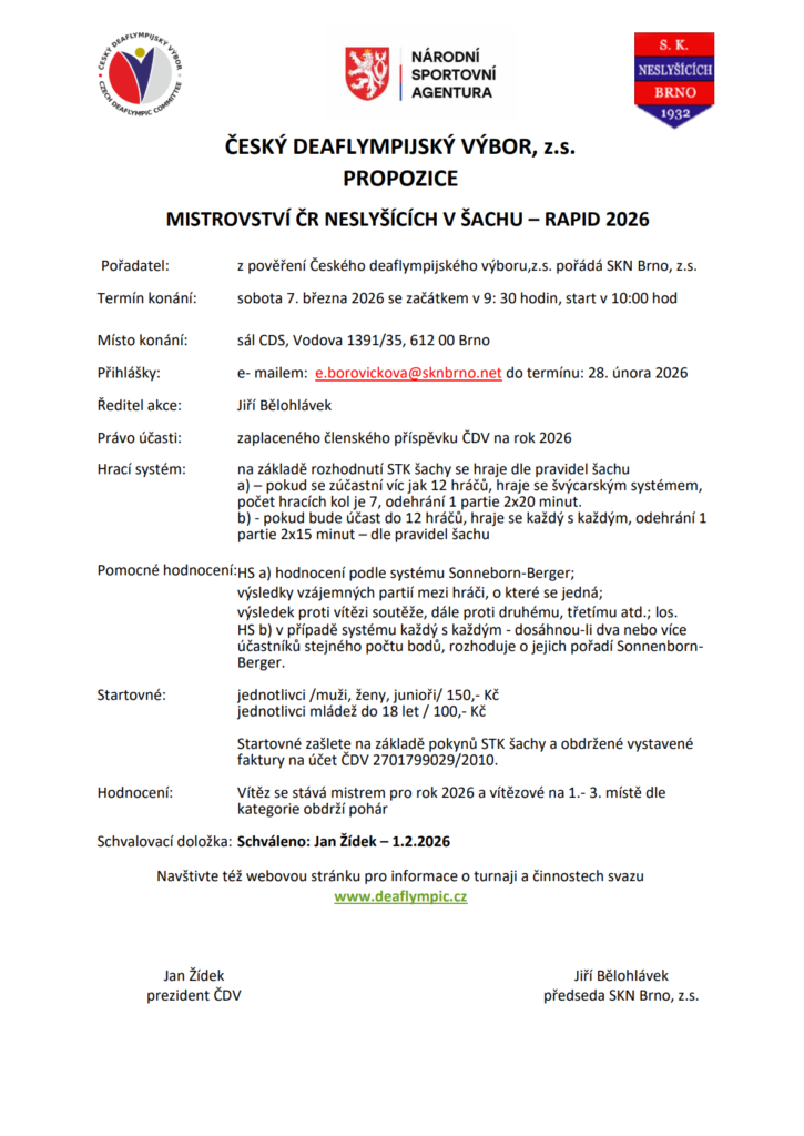 Zveme všechny zájemce na MČR neslyšících v šachu – rapid, které se bude konat 7.3.2026 v Brně. Více informací v propozicích níže.