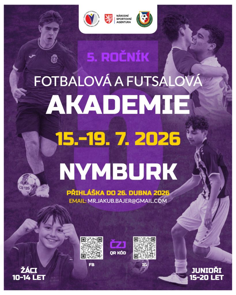 5. ročník fotbalové a futsalové akademie se bude konat 15.-19. července 2026. Další informace můžete najít na sociálních sítích: FB: https://www.facebook.com/share/p/1GdoYoN4hL/?mibextid=wwXIfrIG: https://www.instagram.com/p/DUIt16EjcXx/?igsh=a2NsaWRmYzdhd2dv
