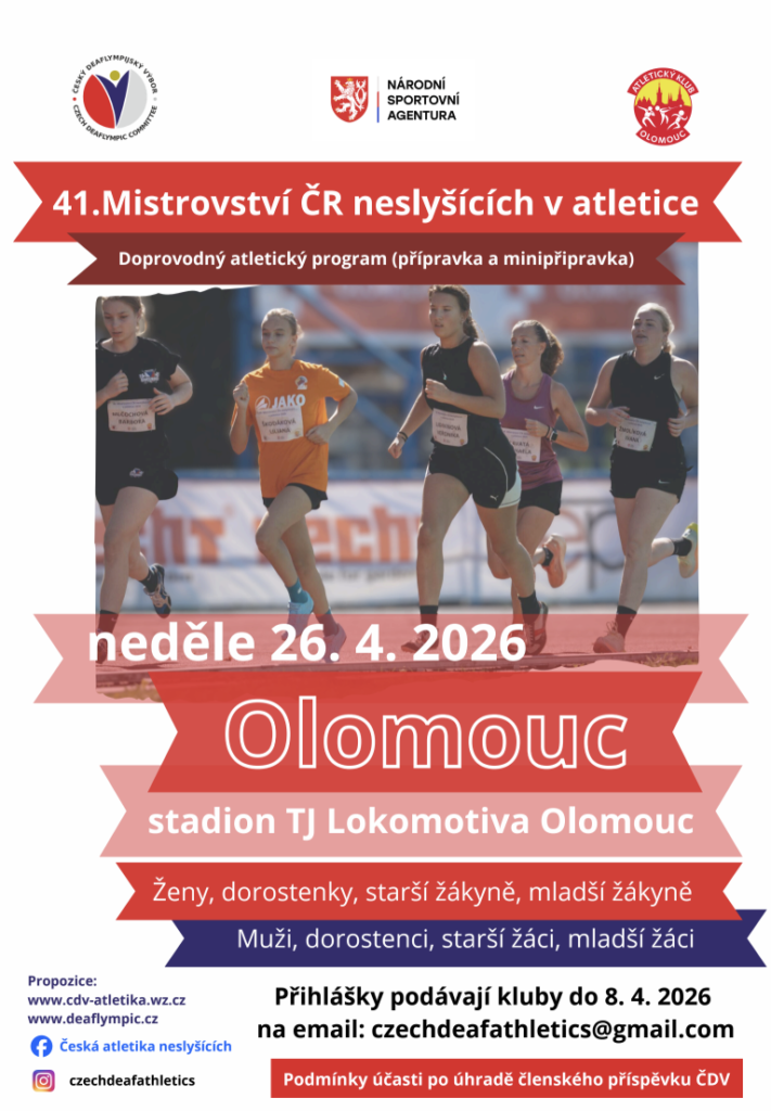 STK atletiky všechny srdečně zve na 41. Mistrovství České republiky neslyšících v atletice, které se uskuteční v neděli 26. dubna 2026 v Olomouci. Součástí programu bude také doprovodný atletický program pro přípravku a minipřípravku. Videopozvánka: https://youtu.be/vr_df-DIF1A?is=cIogVOYmodZQFy5l Přihlášky zasílejte na email sk.olympia@seznam.cz do neděle 5.4.2026.