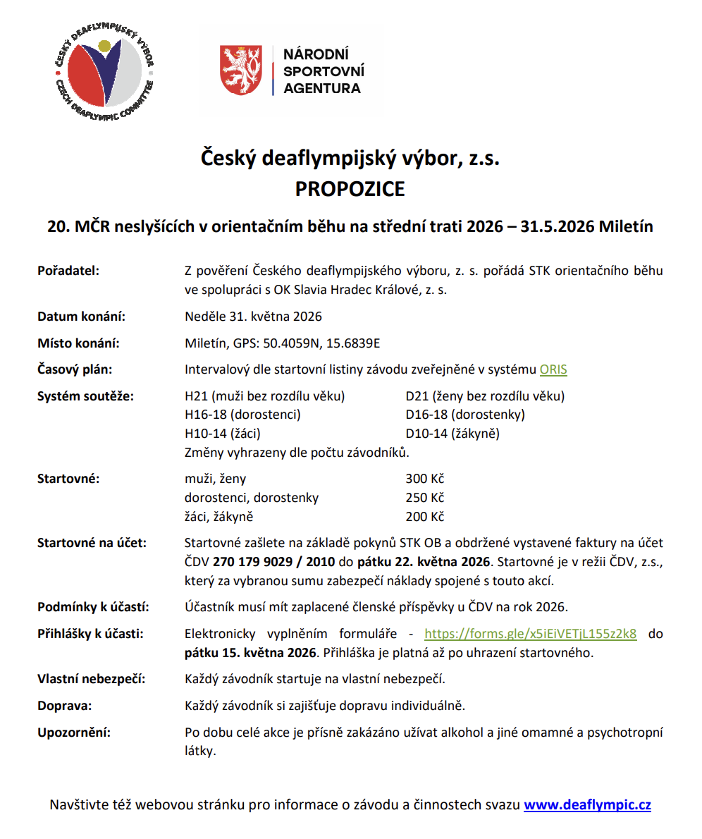 Pozvánka na 20. Mistrovství ČR neslyšících v orientačním běhu na střední trati 2026 (2. kolo ČPN), které se uskuteční v neděli 31. května 2026 v Miletíně. Přihlášení probíhá prostřednictvím online formuláře: https://forms.gle/x5iEiVETjL155z2k8 – nejpozději do pátku 15. května 2026. Upozornění: Startovné hradí klub po obdržení faktury od ČDV za všechny svoje přihlášené sportovce na účet ČDV. Neprovádějte prosím individuální platby. Více informací naleznete v přiložených propozicích (PDF) nebo na webových stránkách Českého OB neslyšících.