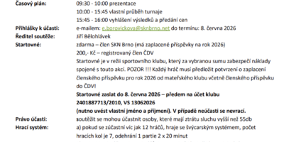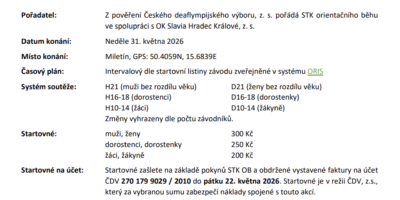 Pozvánka na 20. Mistrovství ČR neslyšících v orientačním běhu na střední trati 2026 (2. kolo ČPN), které se uskuteční v neděli 31. května 2026 v Miletíně. Přihlášení probíhá prostřednictvím online formuláře: https://forms.gle/x5iEiVETjL155z2k8 – nejpozději do pátku 15. května 2026. Upozornění: Startovné hradí klub po obdržení faktury od ČDV za všechny svoje přihlášené sportovce na účet ČDV. Neprovádějte prosím individuální platby. Více informací naleznete v přiložených propozicích (PDF) nebo na webových stránkách Českého OB neslyšících.