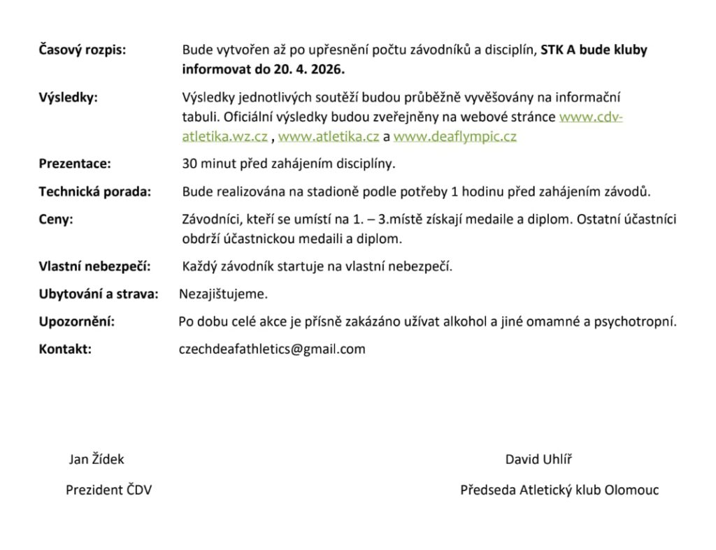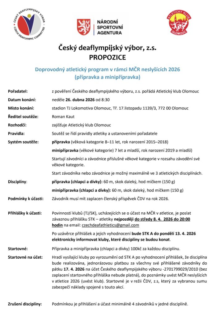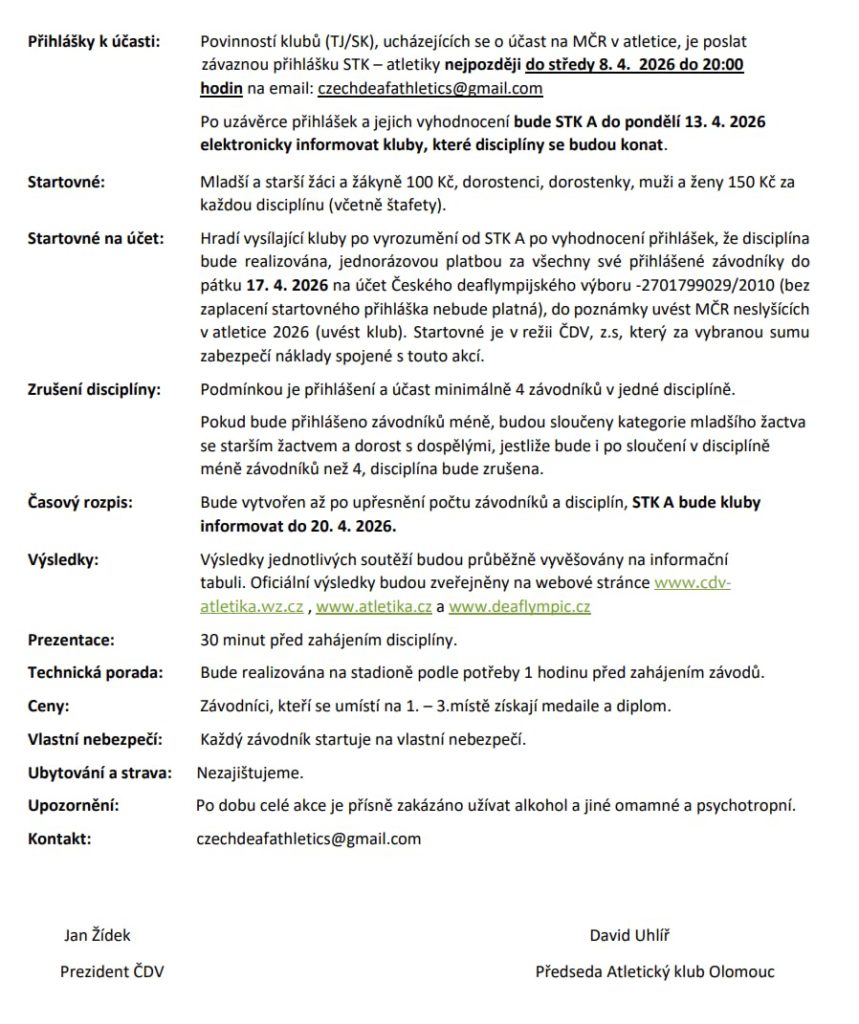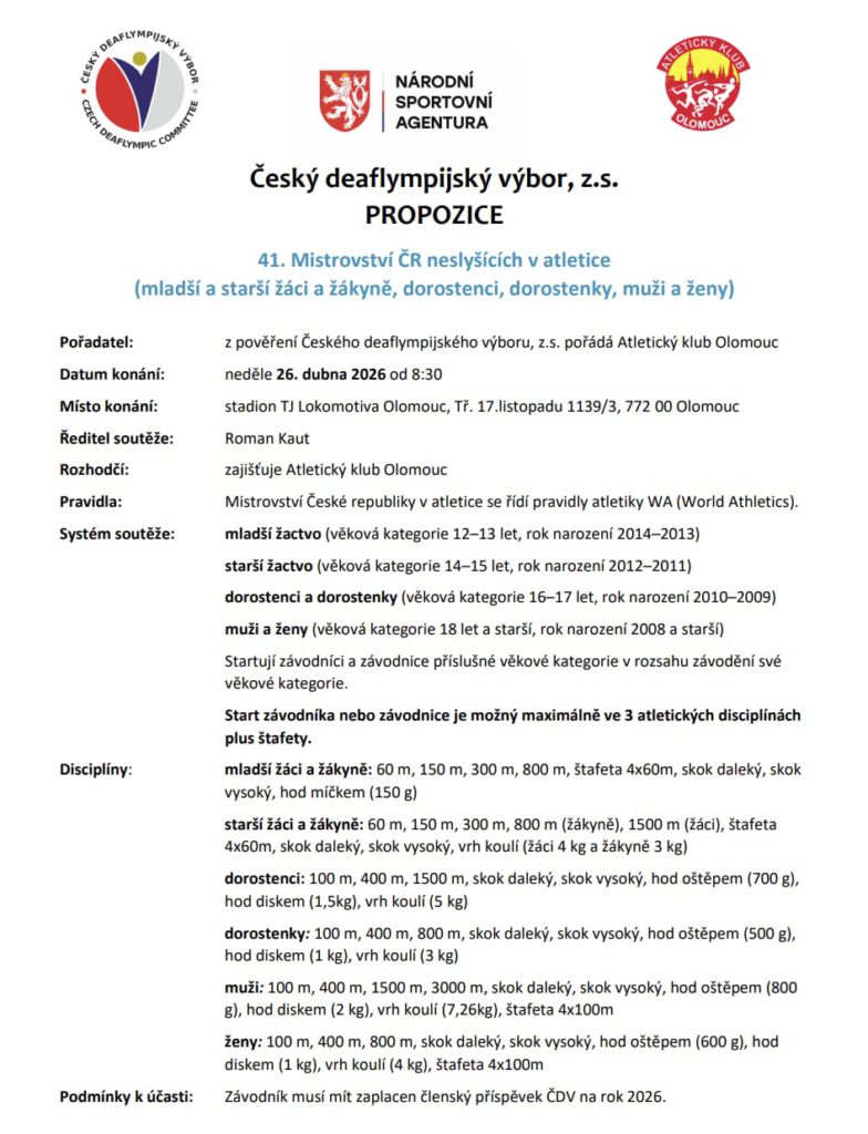 STK atletiky všechny srdečně zve na 41. Mistrovství České republiky neslyšících v atletice, které se uskuteční v neděli 26. dubna 2026 v Olomouci.