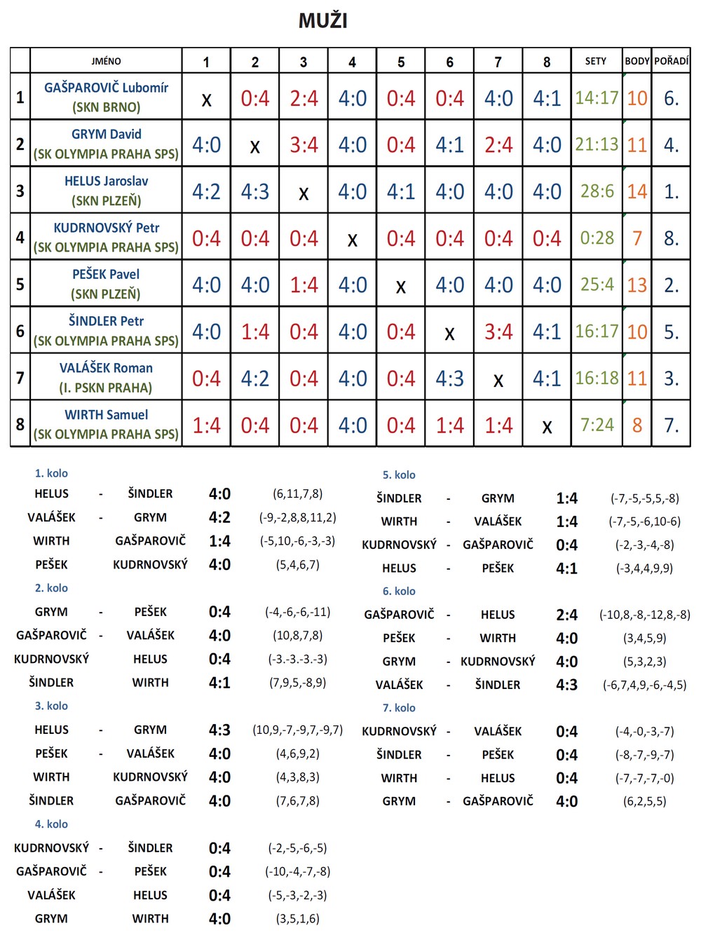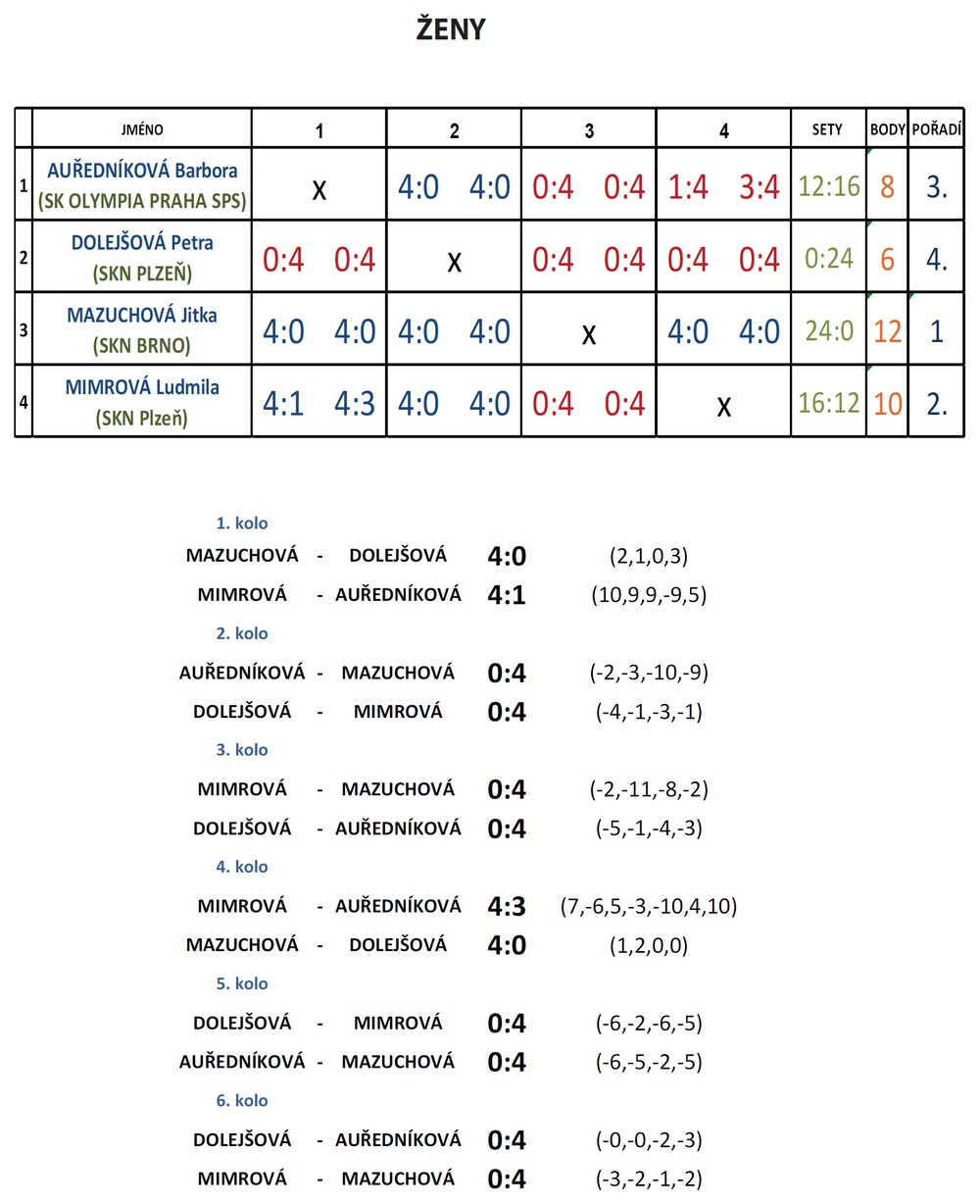 ucast-tenistuV sobotu 16.11. 2019 se konal 6. ročník turnaje OPEN „Pražský pohár‘‘ ve stolním tenisu pro sluchově postižené pořádaný klubem SK Olympia Praha SPS pod záštitou Ministerstvem školství, mládeže a tělovýchovy, Městskou částí Prahy 15 a Českým svazem neslyšících sportovcu. Turnaj proběhl ve sportovní hale Hamr v pražské části Záběhlice. Přihlásilo se 8 mužů a 4 ženy, celkem 12 osob ze čtyř různých klubů - SKN Brno, SKN Plzeň, SK Olympia Praha SPS a I.PSKN Praha. Z našeho klubu se zúčastnilo 5 členů a to v sestavě David Grym, Samuel Wirth, Petr Šindler, Petr Kudrnovský a Barbora Auředníková. Turnaj byl zahájen v 9: 30 proslovem ředitele turnaje Petra Šindlera, který přivítal hráče a vysvětlil systém, jak se budou zápasy hrát. Muži byli seřazeni dle abecedy do jedné skupiny, kde se hrálo systémem každý s každým. Ženy byly v další skupině, kde hrály dvoukolově. Každá žena tak odehrála 6 zápasu a u mužů to bylo 7. Všechny zápasy se hrály na 4 vítězné sety. V hale byly k dispozici 4 modré stoly značky Joola a využívaly  se plastové míčky typu Buttery G40+. Po odehrání poloviny zápasů následovala půlhodinová přestávka, během které si hráči dali oběd v místní restauraci. oceneniPo odehrání všech zápasů mužů se potvrdilo, že vyhrál hlavní favorit Jaroslav Helus ze SKN Plzeň, který obhájil loňské vítězství,  2. místo pak získal další favorit Pavel Pešek ze SKN Plzeň. O 3. místo se ucházeli 4 hráči a byl to mezi nimi boj, který nakonec nejlépe zvládl Roman Valášek z I.PSKN Praha. Mezi ženy zvítězila Jitka Mazuchová z SKN Brno, druhé místo vybojovala Ludmila Mimrová z SKN Plzeň a 3. místo obsadila naše mladá hráčka Barbora Auředníková z SK Olympia Praha SPS. Po odehrání všech zápasů následovalo předání poháru s figurkou stolního tenisty na podstavci prvním třem hráčům u mužů a žen. Turnaj byl ukončen v 16h, proběhl bez komplikací, v příjemné atmosfére a hráči odcházeli spokojení. Další 7. ročník by se měl konat příští rok v listopadu 2020. vysledky-zen-OPP2019 vysledky-muzu-OPP2019