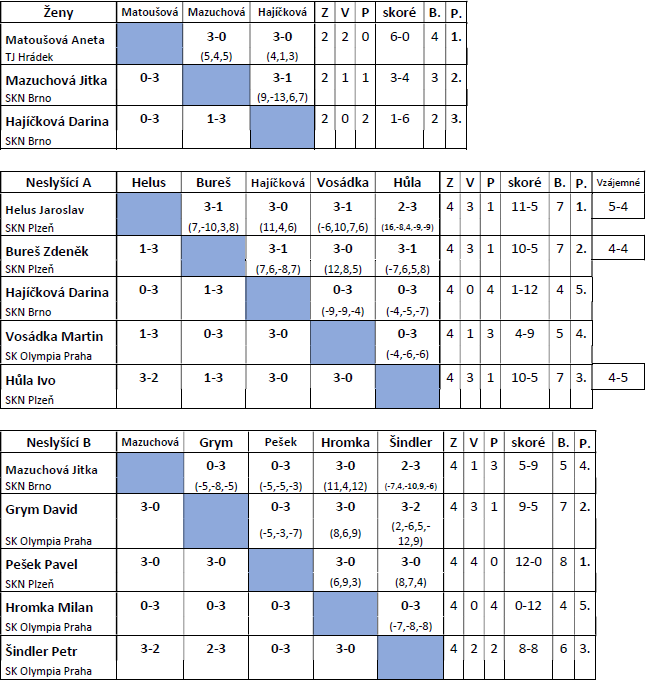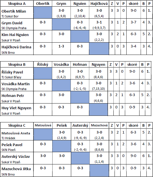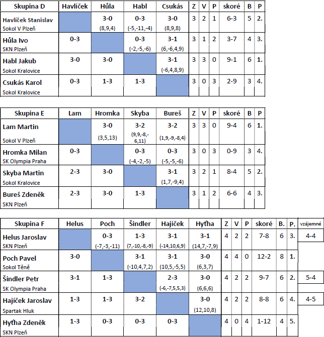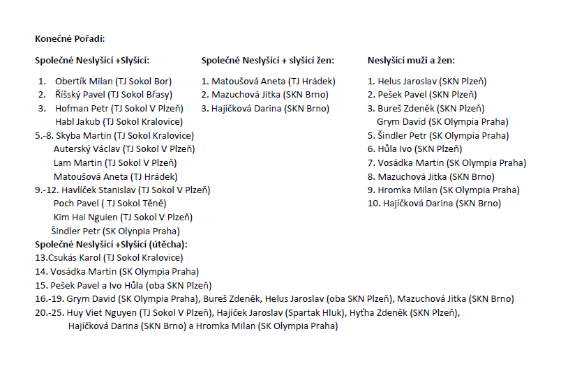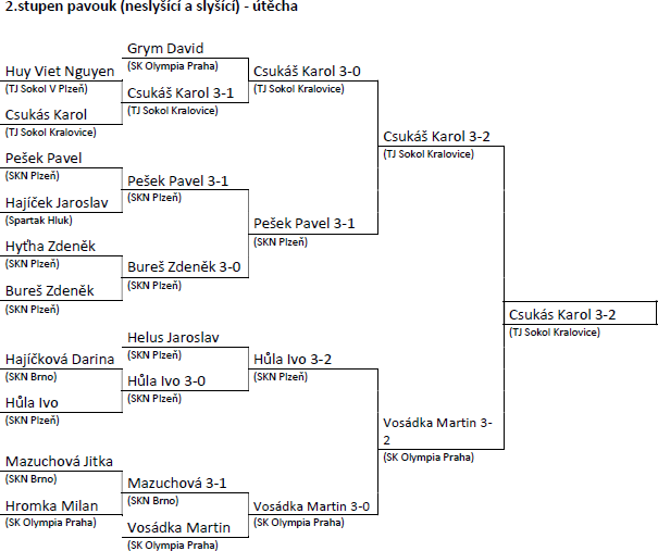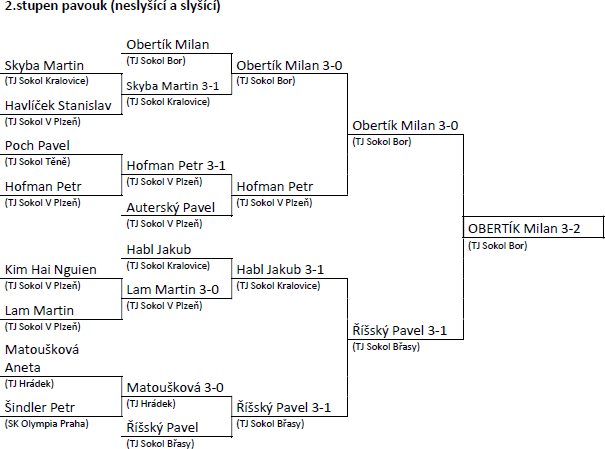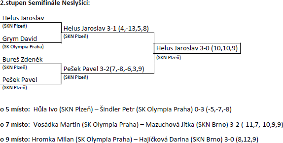 Pak následoval samostatný turnaj neslyšících, kde 10 hráčů byli roztříděni do dvou pětičlenných skupin. Po odehrání všech zápasů pak hráči z 1-2. míst postupovali do semifinále. David Grym ve své skupině vyhrál 3 zápasy a jeden prohrál. Petr Šindler 2v-2p a Martin Vosádka 1v-3p. Hráči umístění na 3-5. místě ve skupinách si zahráli o konečné umístění. V semifinále David Grym prohrál s Jaroslavem Helusem 1:3 na sety. Utkání o 3. místo se nehrálo, umístíli se na ní oba poražení semifinalisté, takže David Grym získal bronzovou medaili. Naši další hráči obsadili 5. místo (Petr Šindler) a 7. místo (Martin Vosádka).