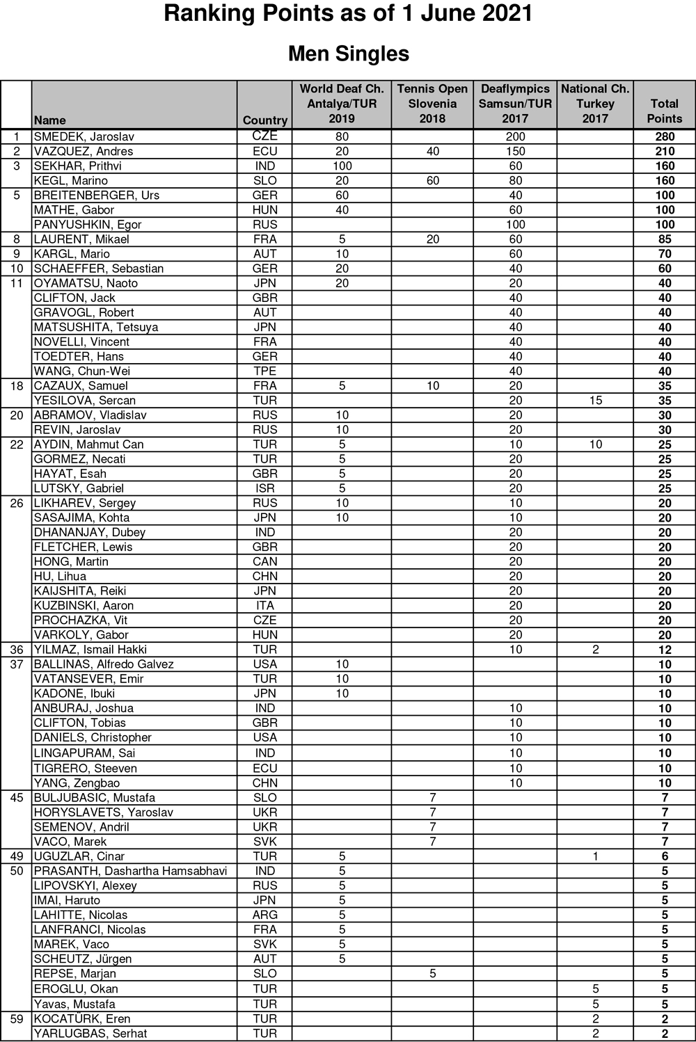 U mužů se řád turnaje nastavil na systém pavouka pro postupující a na pavouka „útěchy“ pro vyřazené z 1. kola zápasů, kde se prvotní zápasy nejprve losovaly živě na FB https://www.facebook.com/100057646112162/videos/1308374293025584. Hrálo se na 2 vítězné sety, přičemž 3. rozhodující set byl nahrazen supertiebreakem do 10 bodů. Dle ICSD (International Committee of Sports for the Deaf) tenisového žebříčku k datu 1.6.2021 byli do turnaje nasazení tito hráči dle pořadí: 1. Jaroslav Šmédek, 2. Marino Kegl, 3. Gábor Máthé, 4. Dávid Hanudeľ (dle odehrání minulých zápasů). U žen se soutěžní systém nastavil na pravidlo „každý s každým“.