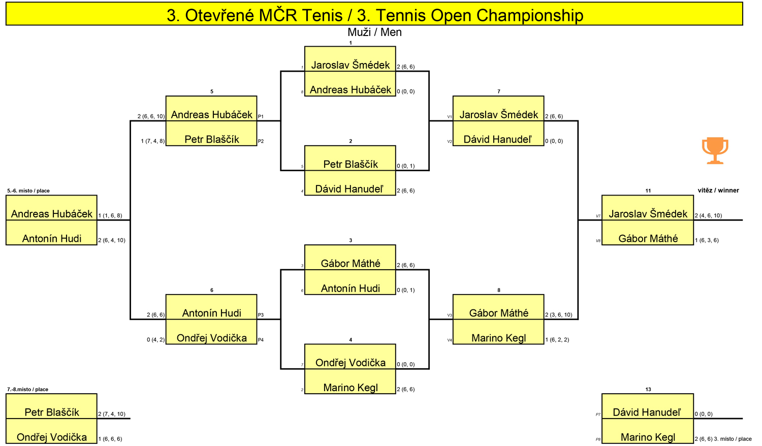 Turnaj probíhal od ranních hodin bez větších komplikací a bez zranění. V rozhodovacích fázích turnaje v boji o 3. místo zvítězil Marino Kegl a u žen zvítězila s plným počtem bodů Sara Twardowska. Mistrovství bylo ukončeno finálovým zápasem mezi Jaroslavem Šmédkem a Gáborem Máthé, kde zvítězil Jaroslav Šmédek. MČR bylo zakončeno těsně před 18:00 h.