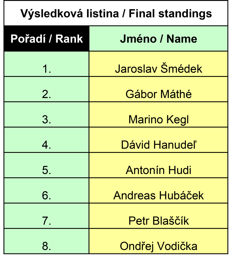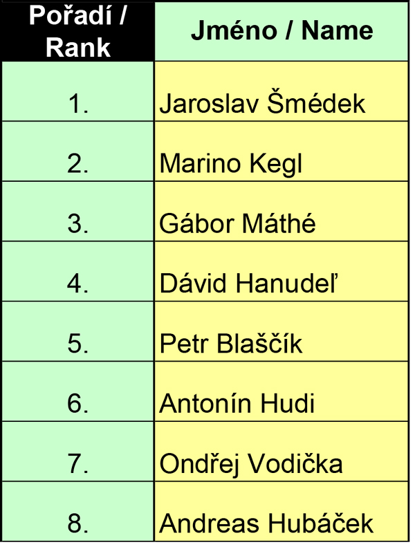 Muži Gábór Máthé (Maďarsko) Marino Kegl (Slovinsko) Dávid Hanudeľ (Slovensko) Andreas Hubáček (SSK Vítkovice) Ondřej Vodička (SSK Vítkovice) Petr Blaščík (SK Olympia Praha SPS) Jaroslav Šmédek (SK Olympia Praha SPS) Antonín Hudi (SK Olympia Praha SPS)