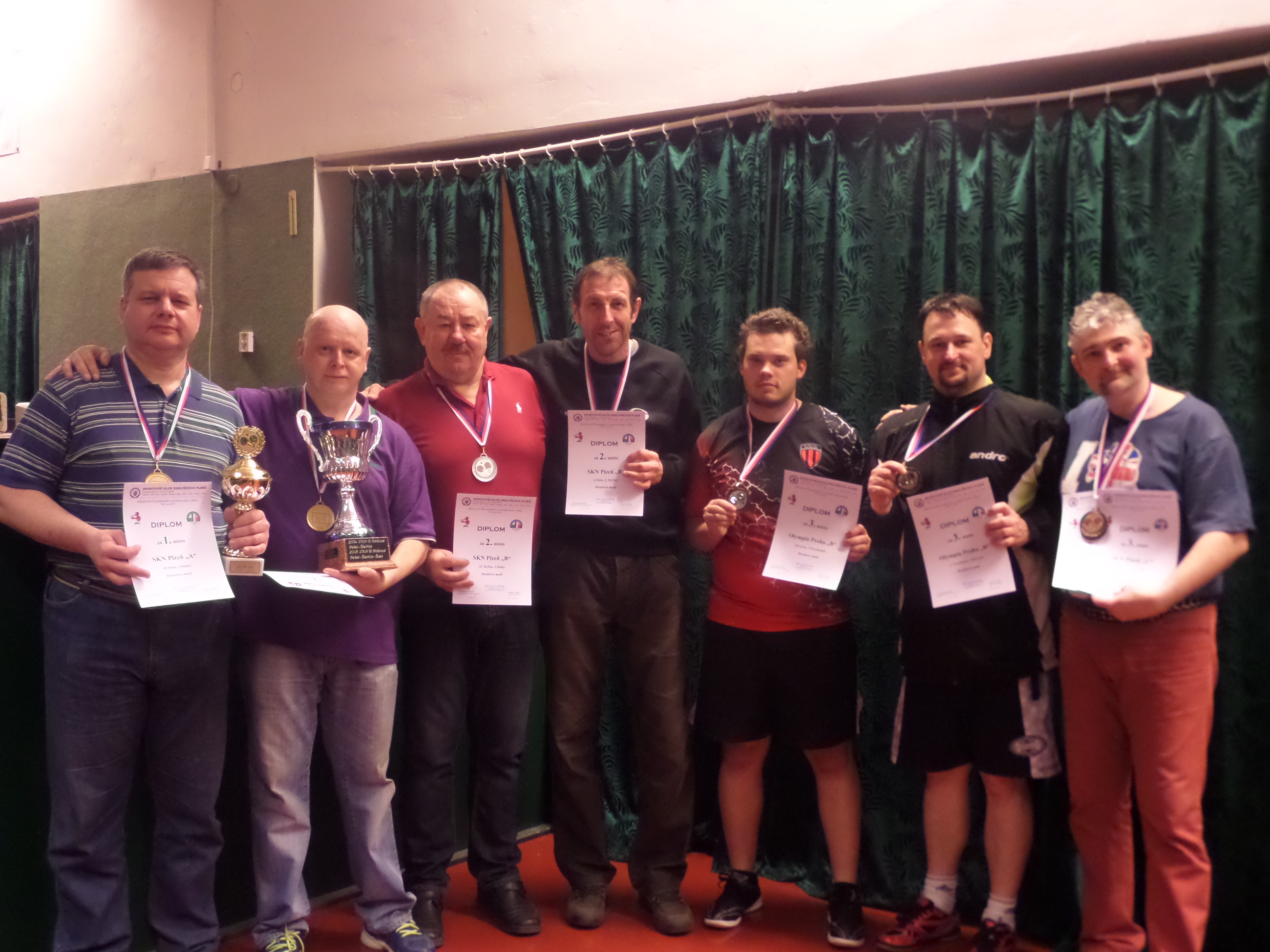 A jak dopadla družstva? Vyhrál pár Helus - Pešek (SKN Plzeň "A"), druhé místo získal pár Hytha - Hůla (SKN Plzeň "B") a ze třetího místa se radovali Mimra s Novotným (SKN Plzeň "C") a Olympia Praha "B" (Procházka, Grym).
