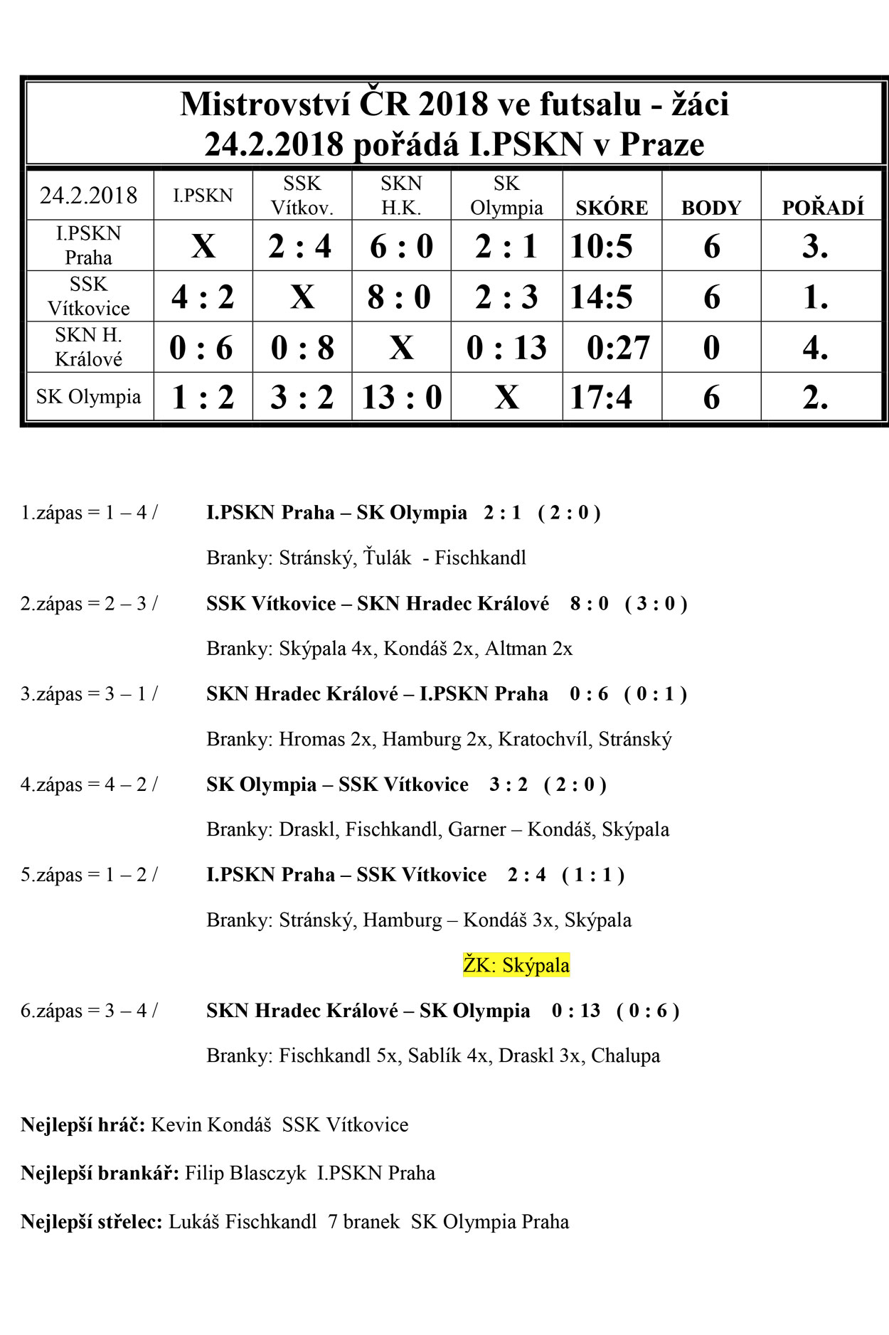 U kategorie žáků bojovaly o pohár 4 týmy, tj. SSK Vítkovice, SKN Hradec Králové, SK Olympia Praha a I.PSKN Praha. U žáků byl souboj vyrovnaný. Celkově na třetím místě se umístil tým z Prahy, I.PSKN. Druhé místo obsadili hráči týmu SK Olympia a na konečné první místo dosáhl tým SSK Vítkovice. Nejlepším střelcem byl vyhlášen náš hráč týmu SK Olympia, Lukáš Fischkandl.
