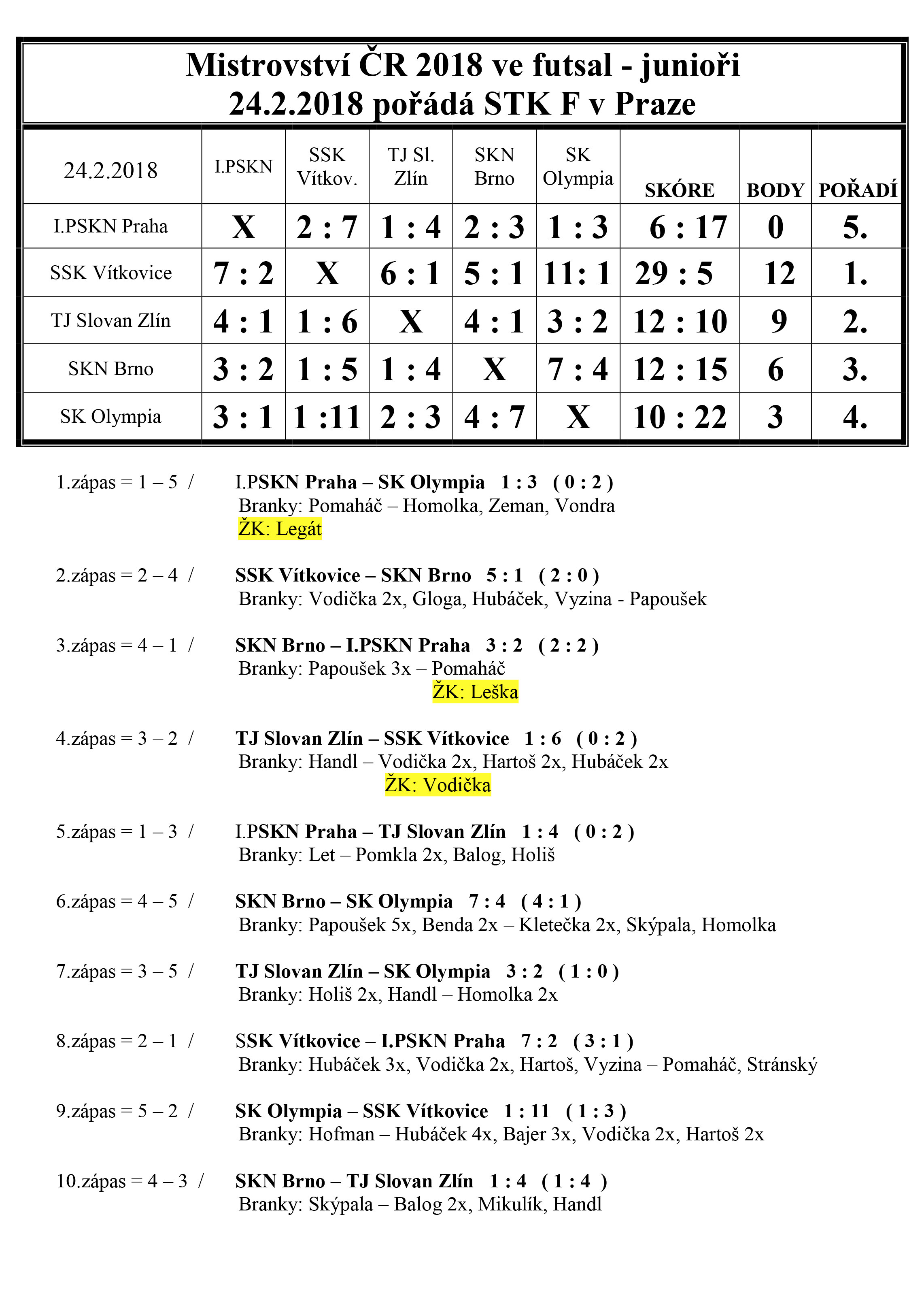 Za juniory bojovaly týmy z TJ Slovan Zlín, SKN Brno, SSK Vítkovice, SK Olympia a I.PSKN Praha. Náš tým se umístil na 4. místě. Detailnější výsledky můžete zhlédnout níže.