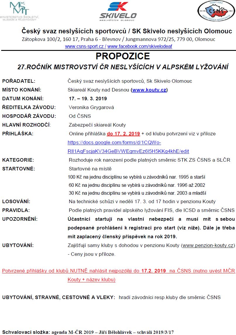 Český svaz neslyšících sportovců a Sk Skivelo Olomouc vás zvou na Mistrovství České republiky neslyšících v alpském lyžování, které se koná 17. až 19. března 2019 v Koutech nad Desnou. Na výběr jsou dvě disciplíny, slalom speciál a obří slalom. Startovné činí 30 až 100 Kč dle věku na jednu disciplínu. Pokud bude mít některý z našich členů zájem se zúčastnit, ať nám nahlásí na info(zavináč)olympiapraha.cz v jaké kategorii bude startovat do 10. února 2019. Veškeré další informace naleznete v propozici nebo níže a informaci o ubytování v Koutech nad Desnou.