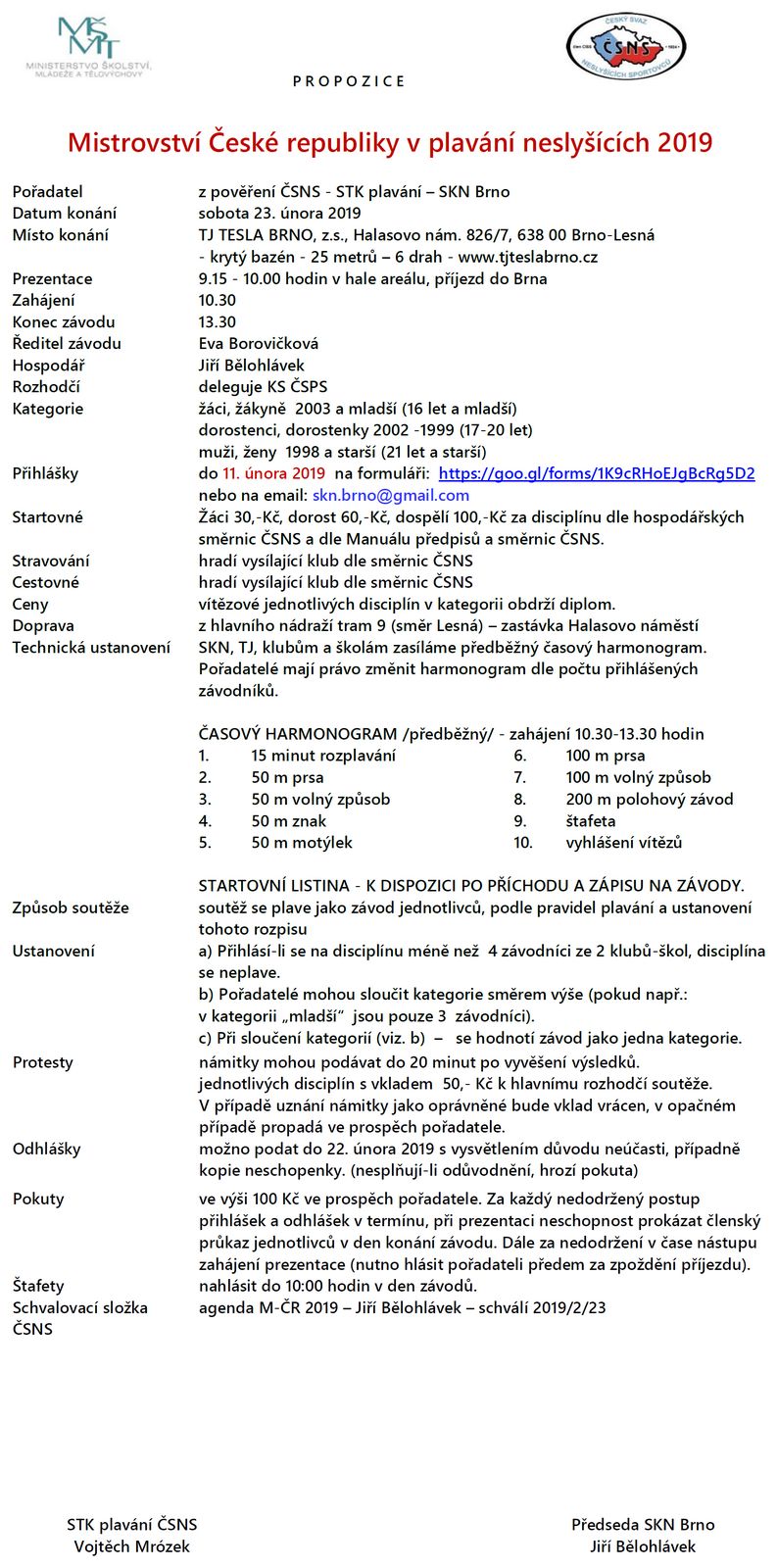 Mistrovství České republiky v plavání, které se koná v sobotu 23. února 2019. Na výběr je několik disciplín (prsa, znak, motýlek, volný způsob, štafeta atd.). Více informací naleznete v