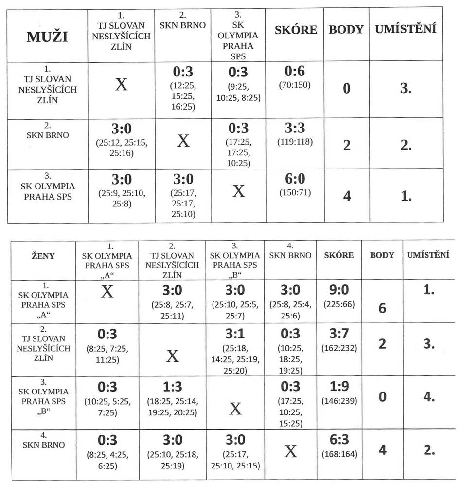 Jak v kategorii mužů, tak i žen se hrálo systémem každý s každým na 3 vítězné sety. U mužů jednoznačně zvítězil tým SK Olympia Praha SPS, na druhém místě se umístil SKN Brno a bronzovou medaili si odvezlo mužstvo TJ Slovan neslyšících Zlín. U žen si zlato vybojovaly hráčky SK Olympia Praha SPS "A", stříbro si odvezly holky z SKN Brno, na třetím místě se umístily hráčky TJ Slovan neslyšících Zlín a na bramborové pozici skončil tým SK Olympia Praha SPS "B".