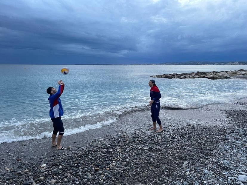 V pátek 2.12. jsme po poledni přiletěli do přímořského letoviska Nice. Odsud jsme se dopravili do hotelu Novotel Aeroport CAP3000 v obci Saint-Laurent-du-Var. Díky české hráčce a trenérce Lucii Robeau jsme měli k dispozici beachové kurty a posilovnu. Hned po příjezdu jsme se tedy vydali na kurty, které byly na nedaleké pláži. Už při první rozcvičce jsme zjistili, že se budeme na tomto soustředění muset „poprat“ s velmi proměnlivými povětrnostními podmínkami. Lucie nám také sehnala kvalitní sparing pro holky i kluky. Dvouhodinový trénink po rozcvičce pokračoval „udržovací hrou“, při které jsme si stále zvykali na vítr. Potom Lucie podávala na holky, Honza na kluky a snažili jsme se uhrát balon, přičemž se střídaly dvojice. Potom se dělalo to samé i s dohrávkou. V dalším kole byl přidán ještě jeden balon nahozený „zadarmo“. Na závěr tréninku jsme si zahráli „side-out“.
